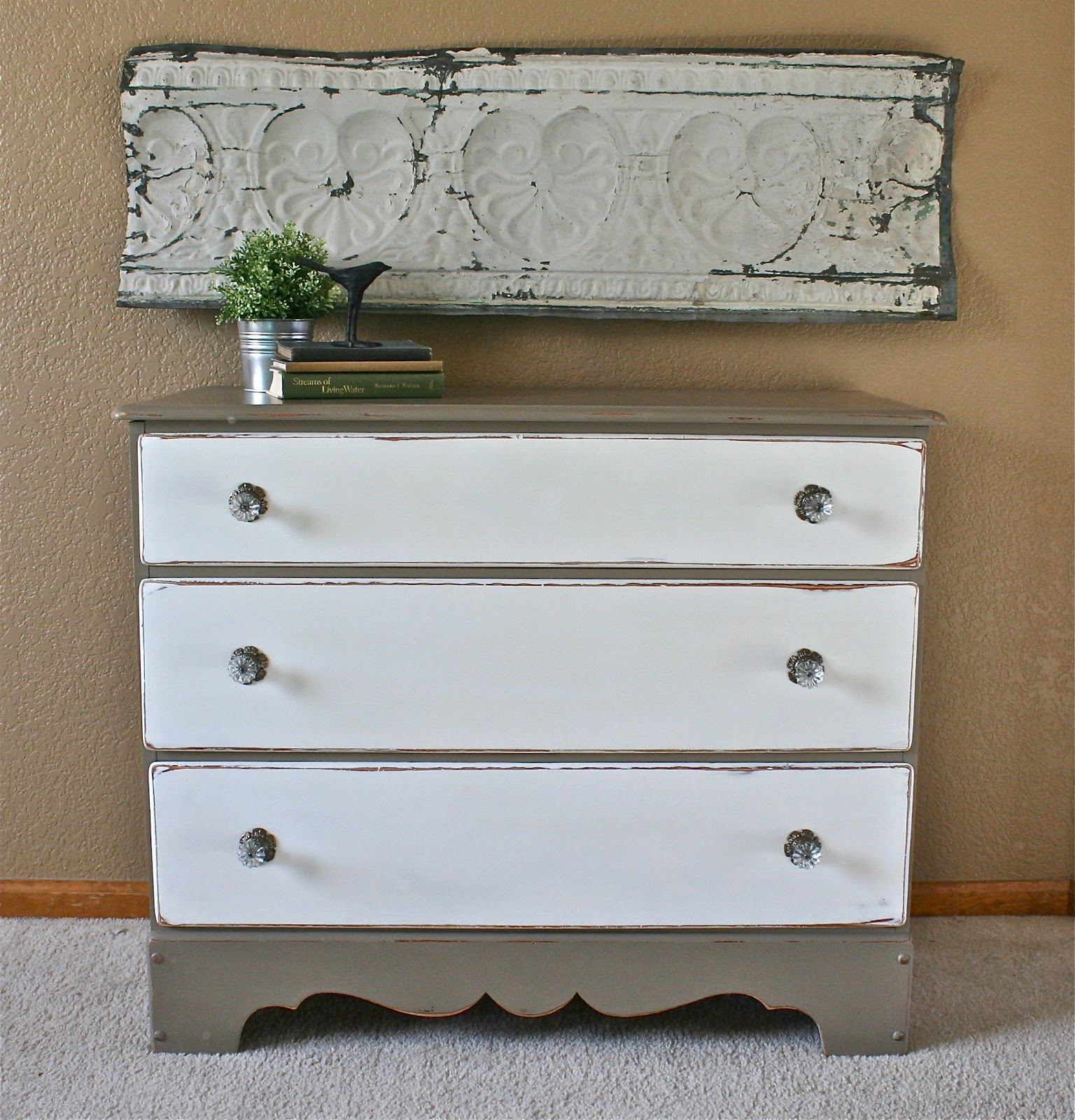 I used Annie Sloan Chalk Paint in Coco and Pure White. I distressed it, waxed it, added some blingy knobs and voila! From boring to beautiful!